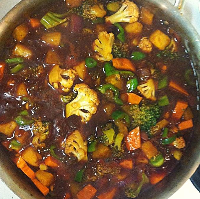 Cook red onions, yam, anaheim peppers, mushrooms, turmeric, tamari, and water on high until boiling then simmer for 10 minutes. Add broccoli, cauliflower, and fresh pineapple, simmer for 3-5 minutes. Add arrowroot. After it has thickened, turn off and remove from stove. Add brown rice vinegar, organic sugar, and miso. Stir.