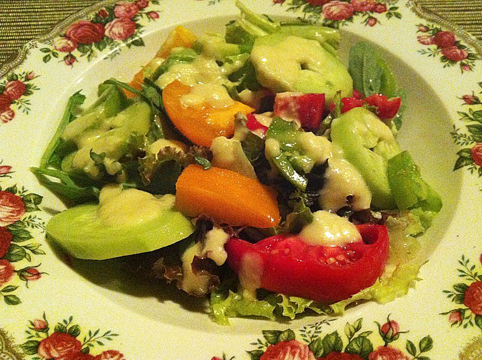 Heirloom tomatoes, heirloom cucumbers, baby greens, and mustard arugula.