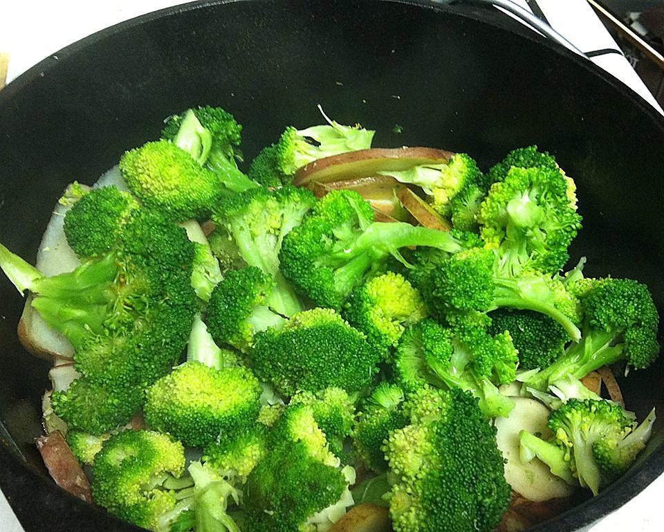 Gently place salmon (skin side down in middle of skillet), next place red potatoes around and on top of salmon. Then place broccoli on top.